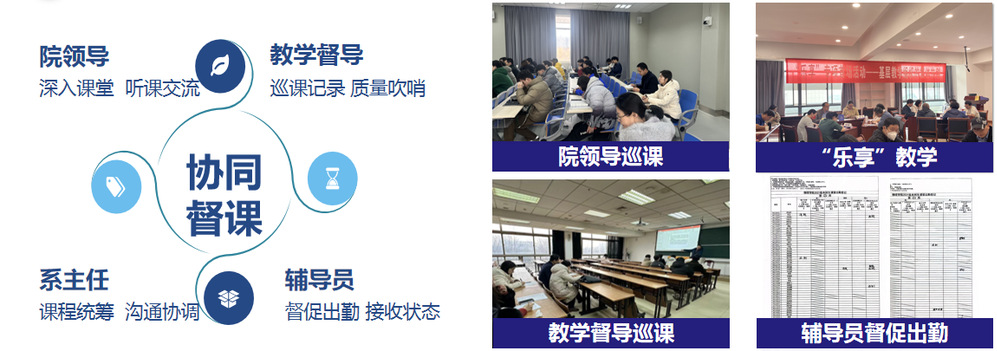 作为基础教学大院,学院一直高度重视教学质量,建立院领导、教学督导、系主任、辅导员协同督课机制,年度深入课堂巡课、听课、查课,百分百覆盖本院全体员工及兄弟学院大学物理班级,教学督导整理汇总建议,助力教师课堂教学水平不断提升。对专业核心课程组织开展过程性测试,开展常态化答疑,形成学习功夫花在平时,知识理解更深更透的良好学习生态。