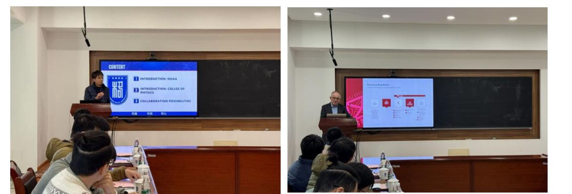 伏洋洋首先对米兰比可卡大学代表团的来访表示热烈欢迎,并由李伟伟教授向代表团成员详细介绍了公司在理论物理、凝聚态物理、核物理与技术和光学等领域的学科特色与国际合作成果,同时强调学院持续推进国际化发展战略的坚定决心,期待通过联合学位共建项目为双方在人才培养与科研创新等领域提供国际化发展平台。